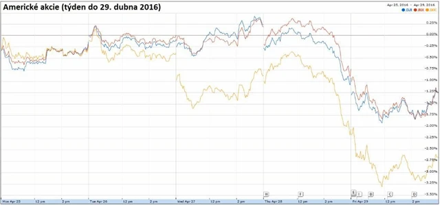 - Výsledky Apple v 1Q: Zisk na akcii 1,9 USD (odhad: 2 USD), tržby 50,56 miliardy USD (odhad: 51,97 miliardy USD). Pokles tržeb o zhruba 13 % meziročně byl pro firmu první od roku 2003. Apple ale prodal více iPhonů, než čekal trh (51,2 milionu vs. 50,3 milionu), a hodnotí pozitivně vývoj byznysu v Číně. Společnost o deset procent zvýšila dividendu a navýšila program odkupu vlastních akcií o 50 miliard USD, do března 2018 chce "vrátit" investorům celkem 250 miliard USD. Akcie v úterní poobchodní fázi -5,6 %.