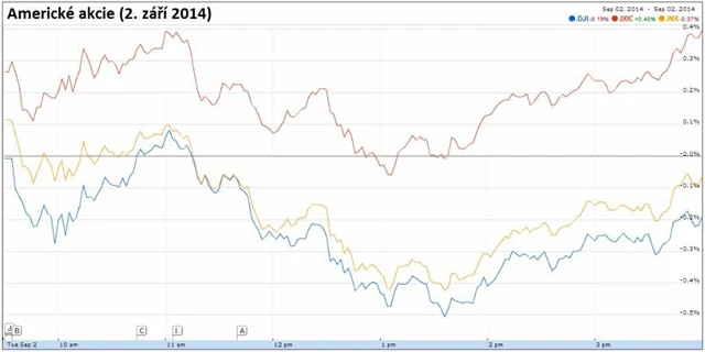 Dow oslabil o 0,18 % na 17 067,56 bodu a širší S&P 500 uzavřel se ztrátou 0,05 % na 2 002,28 bodu. Technologický Nasdaq naopak posílil o 0,39 % na 4 598,19 bodu. Nejvíce zlevnily akcie z odvětví služeb, energetické tituly a cenné papíry ze sektoru základních materiálů. Dařilo se naopak průmyslovému odvětví, telekomunikačnímu sektoru a finančním titulům.
