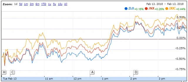 Index Dow stoupl o 0,16 % na 24 640,45 bodu, širší index S&P 500 přidal 0,26 % na 2 662,94 bodu a index technologického trhu Nasdaq Composite se zvýšil o 0,45 % na 7 013,51 bodu. Index volatility VIX klesl o 2,5 % na 24,97 a výnos 10letých vládních dluhopisů USA se snížil o přibližně dva a půl bazického bodu na 2,833 %.