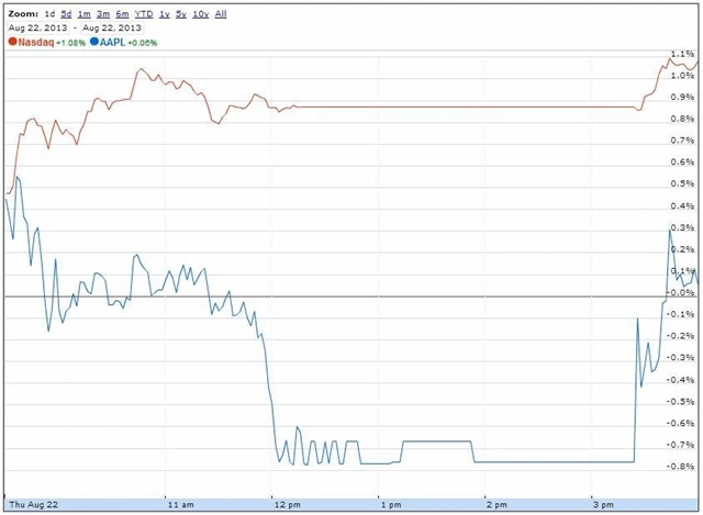 Bez povšimnutí trhem neprošlo ani 4dolarové oslabení akcií Apple, které těsně předcházelo pozastavení obchodování se všemi tituly kotovanými na trhu Nasdaq. Pokles o necelé procento je sice zanedbatelný, analytici ovšem takřka ihned po pozastavení obchodování začali upozorňovat, že je zvláštní, že se Apple velmi rychle vydal proti indexu, který v tu dobu naopak o necelé procento posiloval. Po obnovení obchodování Apple ztráty vymazal a uzavřel se ziskem 0,12 % na 502,96 USD.