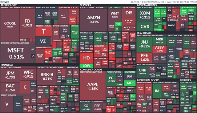 Akcie ve Spojených státech ve středu oslabovaly vlivem zprávy o tom, že Spojené státy a Čína možná nedokončí první fázi obchodní dohody letos, ale až v příštím roce. Zápis z říjnového zasedání americké centrální banky trh příliš neovlivnil.