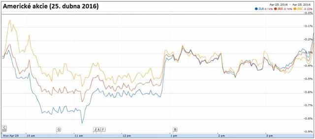 Dow klesl o 0,15 % na 17 977,24 bodu, širší S&P 500 odepsal 0,18 % na 2 087,79 bodu a Nasdaq Composite uzavřel se ztrátou 0,21 % na 4 895,79 bodu. Index volatility VIX vzrostl o 6,51 % na 14,08 bodu a výnos 10letých vládních dluhopisů USA se zvýšil o dva bazické body na 1,909 %.
