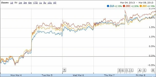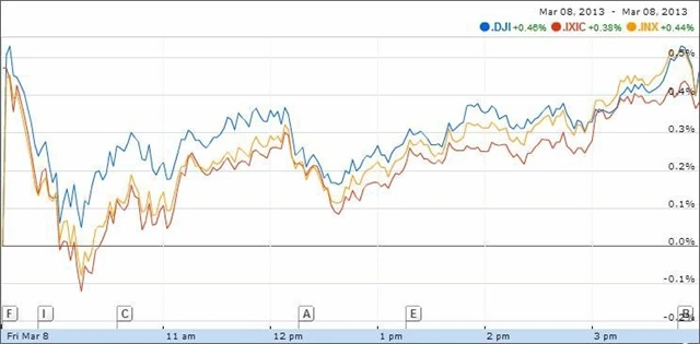 Páteční obchodování se neslo na vlně pozitivních dat z amerického trhu práce. Míra nezaměstnanosti klesla v únoru na 7,7 % z lednových 7,9 %, nových míst vzniklo výrazně více, než se čekalo.