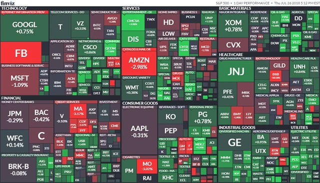 Akcie internetové společnosti Facebook (-18,96 %) zažily nejhorší den od vstupu na burzu v roce 2012. Jejich cena se kvůli obavám o budoucí zisky podniku a pokles marží propadla o bezmála 20 %. Tržní hodnota firmy se tak snížila o přibližně 120 miliard dolarů.
