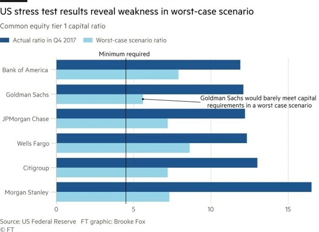 Pětatřicet amerických bank by během hluboké krize podle Fedu přišlo o 578 miliard USD. Z šestice největších bank v testech nejhůře dopadl finanční ústav Goldman Sachs. Loni se testů zúčastnilo 34 bank a také tehdy jimi všechny prošly.