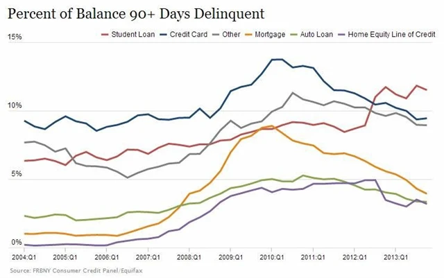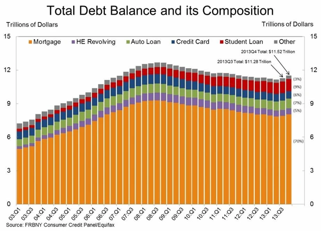Z aktuálních dat newyorské pobočky americké centrální banky vyplývá, že se americké domácnosti šest let po začátku finanční krize začaly opět výrazně zadlužovat. Souhrnné půjčky amerických domácností vzrostly mezi říjnem a prosincem loňského roku o 2,1 % neboli 241 miliard dolarů na 11,52 bilionu dolarů, což představuje největší čtvrtletní nárůst od roku 2007.