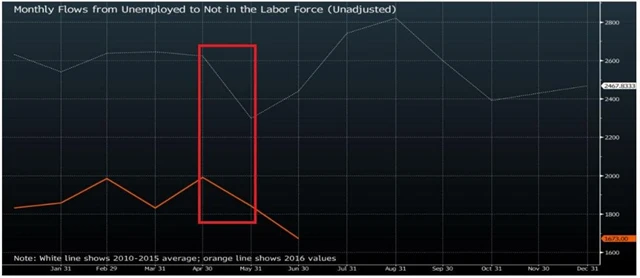 Květnové snížení míry nezaměstnanosti (na 4,7 % z 5 %), pokles míry participace (na 62,6 % z 62,8 %) a slabá tvorba nových míst trhy vyděsily. Podle Johna Robertsona, ekonoma atlantské pobočky Fedu, byl ale květen jistou anomálií. Americký statistický úřad data z trhu práce standardně očišťuje o sezónní vlivy. Jedním z faktorů, jež bere v potaz, je i konec školního roku přivádějící na pracovní trh mladé lidi, kteří si chtějí během prázdnin přivydělat. Jak ale Robertson upozorňuje, letos byl tento efekt slabší než obvykle, takže klasické očištění dat umocnilo úbytek počtu nezaměstnaných v kategorii pracovní síly, a tedy negativně ovlivnilo jak míru nezaměstnanosti, tak míru participace.