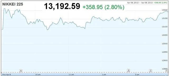 Asijským akciím v pondělním obchodování dominovalo opět Japonsko. Po oznámení Bank of Japan o chystaném kvantitativním uvolňování Nikkei 225 stále výrazně posiluje, připsal 2,80 % na 13 192,60 bodu, což představuje rekord za posledních čtyři a půl roku a jen oslabil vůči dolaru nejvíce od června 2009.