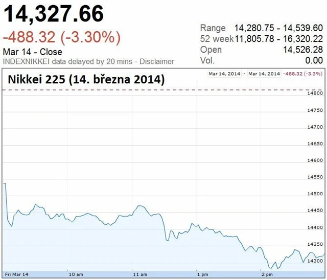 Na trzích vládnou obavy kvůli rostoucímu napětí před víkendovým referendem o odtržení Krymu od Ukrajiny. Znepokojení převládá i na ekonomické frontě kvůli sérii nepříliš příznivých údajů z čínské ekonomiky. Investory tak zvýšená nejistota vede k přechodu od rizikových do bezpečných aktiv, mezi která patří mimo jiné japonský jen, jehož růst přispívá k propadu japonských akcií.
