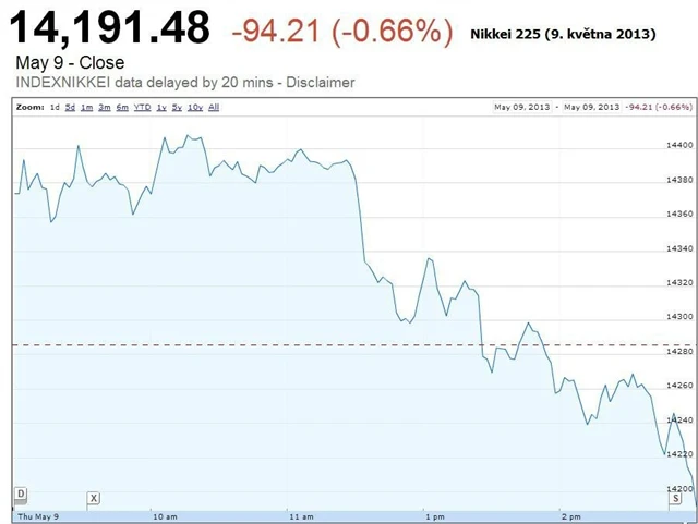Nikkei nejdříve mírně posiloval, v průběhu dne však všechny své zisky odevzdal a zakončil o 0,66 % slabší. Korejský KOSPI díky rozhodnutí centrální banky posílil o 1,18 % a australský S&P/ASX 200 zakončil jen v mírném mínusu 0,03 %. Australské akcie sice podpořila data z trhu práce (v dubnu vzrostla zaměstnanost o 50 100 lidí namísto očekávaných 11 000), investory však zneklidnila zrychlující inflace v Číně (meziročně +2,4 % oproti březnovým 2,1 %, odhad: 2,3 %).
