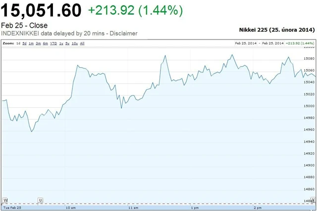 Nikkei zpevnil o 1,44 % na 15 051,60 bodu, čínský Shanghai Composite naopak dvě procenta ztratil a hongkongský Hang Seng odepsal 0,32 %. Australský S&P/ASX 200 mírně klesl o 0,12 %, zato jihokorejský Kospi si polepšil o 0,81 %.