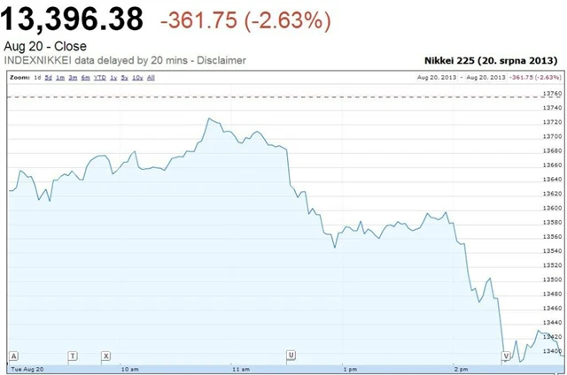 Japonský Nikkei v úterý odepsal 2,63 %, čínský Shanghai Composite ztrácel kolem 0,6 % a hongkongský Hang Seng téměř 2 %. Korejský Kospi spadl o 1,55 % a australský S&P/ASX 200 klesl o 0,67 %.