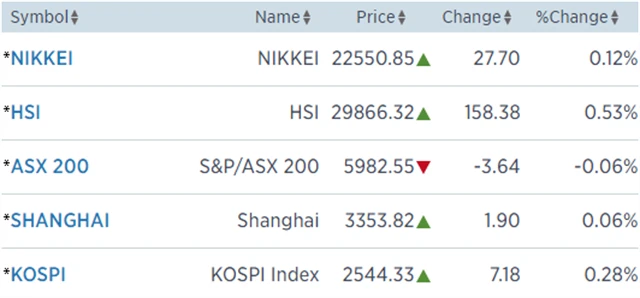 Jihokorejský Kospi vzrostl o 0,28 %, když si největší jihokorejská společnost Samsung Electronics připsala 0,29 %. V mínusu však uzavřel finanční sektor. Australský S&P/ASX 200 ztratil 0,06 %. Dolů jej stáhlo zejména odvětví informačních technologií.