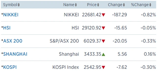 Japonský Nikkei 225 prohloubil ztrátu z předcházející seance, když klesl o 0,82 %. Jihokorejský Kospi přišel o 0,3 % a australský S&P/ASX 200 odepsal 0,33 %. Dolů jej stáhl sektor základních materiálů. Akcie Rio Tinto zlevnily o 2,26 %, BHP Billiton ztratila 1,96 %.