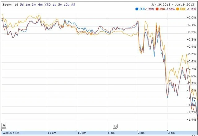 Americké akcie ve středu zahájily obchodování kolem nuly a mezi ziskem a ztrátou kolísaly většinu dne kvůli očekávané tiskové konferenci Bena Bernankeho po zasedání FOMC. Po ní se začaly propadat, protože Bernanke naznačil, že by odkupy dluhopisů mohl Fed začít utlumovat již letos.