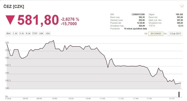 Akcie ČEZ v reakci na prohlášení Bulharska padají o 2,6 %.