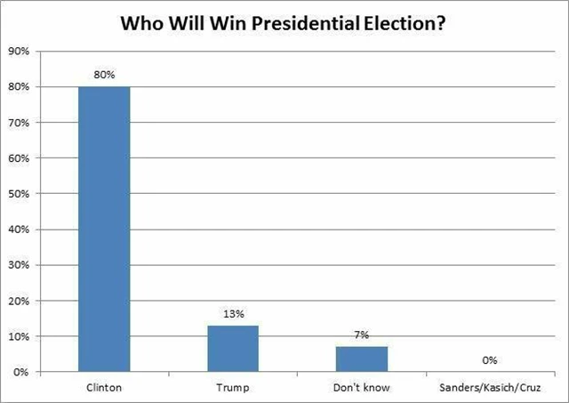 Průzkum finanční televize CNBC ukázal, že si 80 % respondentů z Wall Street myslí, že volby ve Spojených státech ovládne Hillary Clintonová. Ve vítězství Donalda Trumpa věří jen 13 % dotázaných, ostatní si nedovolují vítěze prezidentského klání tipovat. Ve vítězství Bernieho Sanderse, Teda Cruze či Johna Kasicha z dotázaných nevěří nikdo.