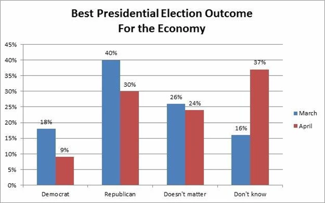 Zajímavé přitom je, že za pozitivní pro ekonomiku USA považuje vítězství demokratického kandidáta, respektive kandidátky pouze 9 % dotázaných (v březnu 18 %), zatímco vítězství republikánského zástupce by bylo pro americké hospodářství přínosem podle 30 % respondentů (v březnu dokonce 40 %).