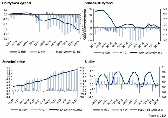 "V oblasti cen výrobců je situace stále obdobná, meziroční pokles cen průmyslových výrobců je tažen zejména několika cenovými okruhy. Kategorie koks a rafinované ropné produkty svůj meziroční pokles cen opět prohloubila, a to i přes efekt nižší srovnávací základny z minulého roku (ceny se začaly propadat v prosinci 2014). Ceny tak v únoru dále meziročně poklesly o zhruba 25 % a celkově přispěly k poklesu cen v průmyslu 1,7 procentního bodu. Dále je pokles cen koncentrován v poklesu cen kovových výrobků (-5,8 % meziročně, příspěvek -0,7 procentního bodu) a elektřiny (-4 % meziročně, příspěvek -0,7 procentního bodu). Z celkového meziročního poklesu cen průmyslových výrobců o 4 % tak uvedené tři kategorie přispívají k poklesu 3,1 procentního bodu, což ilustruje, že výrazný pokles cen průmyslových výrobků je silně koncentrován zejména v několika cenových okruzích. Nicméně ani v ostatních kategoriích průmyslových výrobců není prozatím patrný růst cen a ceny vesměs stagnují, respektive mírně klesají," říká Jakub Seidler, hlavní ekonom ING pro ČR.