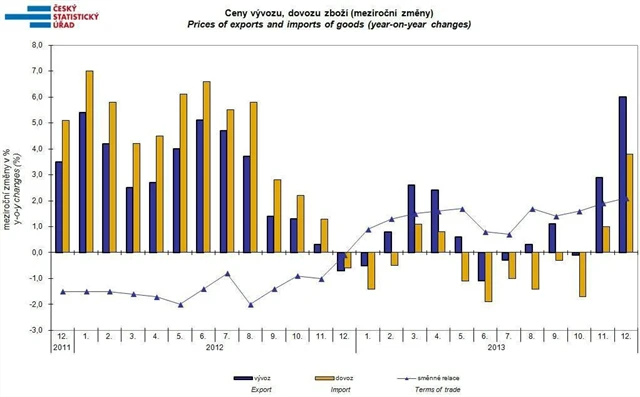 V prosinci 2013 vývozní ceny meziměsíčně vzrostly o 2,2 %, dovozní ceny o 1,7 %, směnné relace dosáhly hodnoty 100,5 %. Meziročně se vývozní ceny zvýšily o 6,0 %, dovozní ceny o 3,8 %, směnné relace dosáhly hodnoty 102,1 %. V průměru za celý rok 2013 v porovnání s rokem 2012 se vývozní ceny zvýšily o 1,2 %, dovozní ceny se snížily o 0,2 %, směnné relace činily 101,4 %.