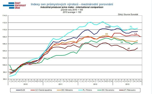 Ceny průmyslových výrobců se na úhrnu meziročně nezměnily (v září vzrostly o 0,6 %). Snížily se zejména ceny v oddílu koksu a rafinovaných ropných produktů o 8,5 %, chemických látek a výrobků o 3,1 %, těžby a dobývání o 3,0 % a obecných kovů a kovodělných výrobků o 1,8 %. Ceny elektřiny, plynu a páry vzrostly o 3,8 %, dopravních prostředků o 1,7 %, z toho ceny dílů a příslušenství pro motorová vozidla o 2,5 %. Ceny potravinářských výrobků, nápojů a tabáku se zvýšily o 0,7 %, z toho mléčných výrobků o 11,6 % a masa a masných výrobků o 1,6 %, naopak ceny rostlinných a živočišných olejů a tuků klesly o 18,4 % a průmyslových krmiv o 7,7 %.