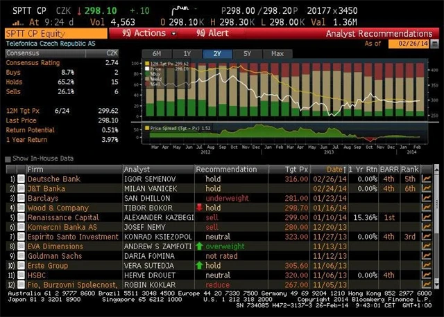 Bez vlivu jednorázové položky by zisk EBIT dosáhl 1,93 miliardy Kč (meziročně -10 %, lepší než odjad trhu). Pokles tržeb v mobilním segmentu (-12 % meziročně) byl tažen 62% meziročním snížením poplatku z ukončení hovorů a nižší efektivní jednotkovou cenou za volání a SMS v důsledku zavedení FREE tarifů. "Bez jednorázového výnosu byly výsledky víceméně v souladu s našimi odhady, avšak výsledky nyní nejsou určujícím faktorem pro vývoj ceny akcií společnosti. Trochu překvapením pro trh by mohl být návrh dividendy z loňského zisku. Trh nyní čeká na výkup minorit, cena by měla být oznámena v blízké době. Očekáváme 298,6 Kč při zohlednění diskontování pozdějších plateb," uvedl analytik Václav Kmínek z České spořitelny.