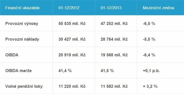 Finanční ukazatel OIBDA (bez zahrnutí licenčních poplatků a poplatků za řízení) poklesl v roce 2013 o 6,4 %. Objem volných peněžních toků se v roce 2013 zvýšil meziročně o 3,2 % na 11,582 miliardy Kč.