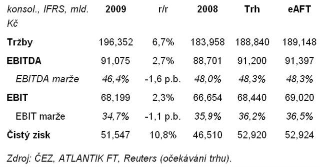 ČEZ také zveřejnil svůj výhled na výkonnost v roce 2010, EBITDA je tak plánovaná na 88,7 mld. Kč a čistý zisk na 46,7 mld. Kč. Pokles výkonnosti ČEZu v roce 2010 je však očekávaný (Bloomberg: EBITDA 89,9 mld. Kč, NI 49,2 mld. Kč). My čekáme EBITDA za rok 2010 na úrovni 89,2 mld. Kč, výhled ČEZu je tak prakticky v souladu s naším očekáváním. Na úrovni čistého zisku jsme mírně pozitivnější (eAFT: NI 50,2 mld. Kč). Výhled ČEZu na úrovni čistého zisku se nám jeví poměrně konzervativní vzhledem k výhledu na provozní úrovni, který je blízko našemu očekávání. V roce 2010 budou již celý rok konsolidovány zahraniční účasti (Turecko, MIBRAG) a vzhledem k faktu, že zisk v roce 2009 ovlivnil výrazně odpis goodwillu v Polsku, by trh mohl na tento výhled reagovat mírně negativně.