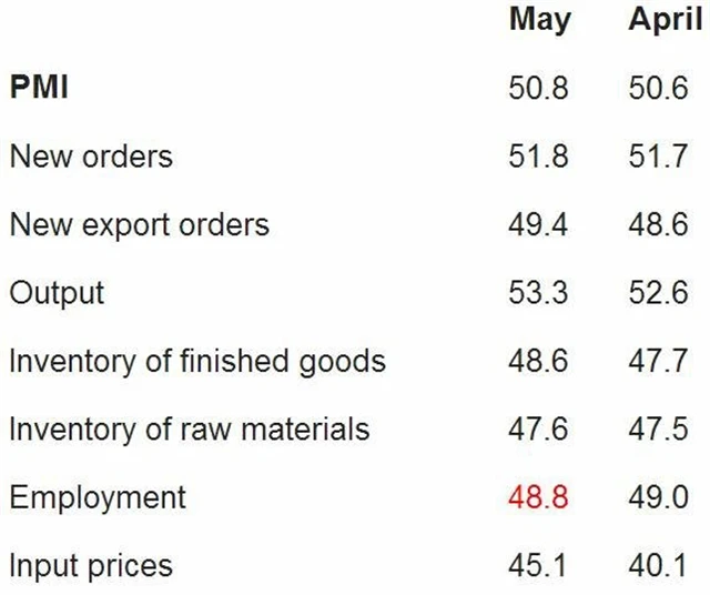 Oficiální PMI ve zpracovatelském sektoru v Číně v květnu nečekaně vzrostl na 50,8 bodu z dubnových 50,6 bodu. Čekal se pokles na rovných 50 bodů. Obdobný index HSBC Markit v květnu předběžně klesl na sedmiměsíční minimum 49,6 bodu.