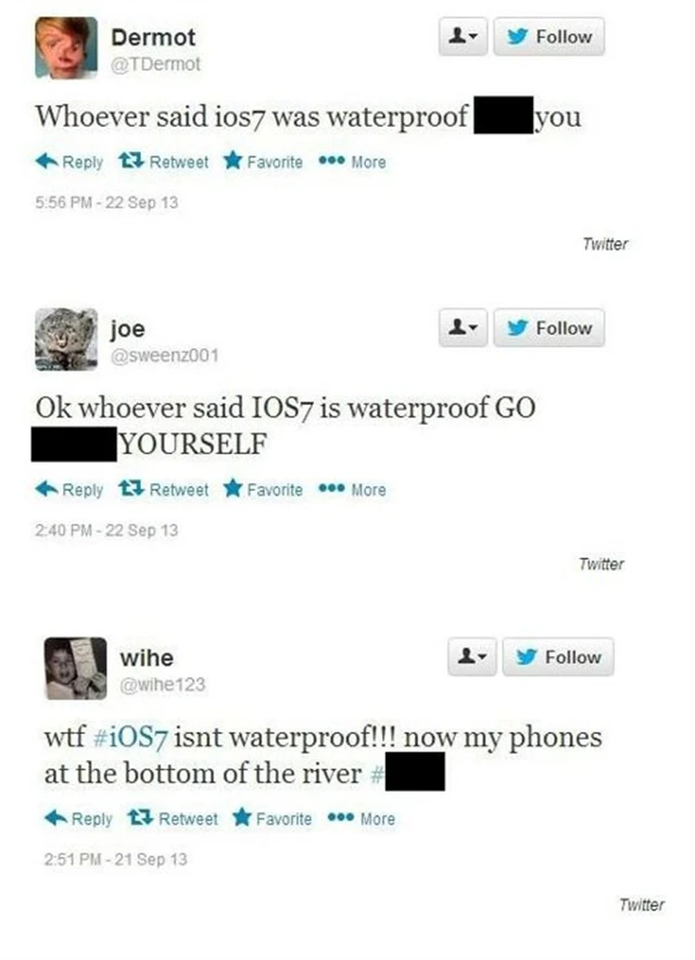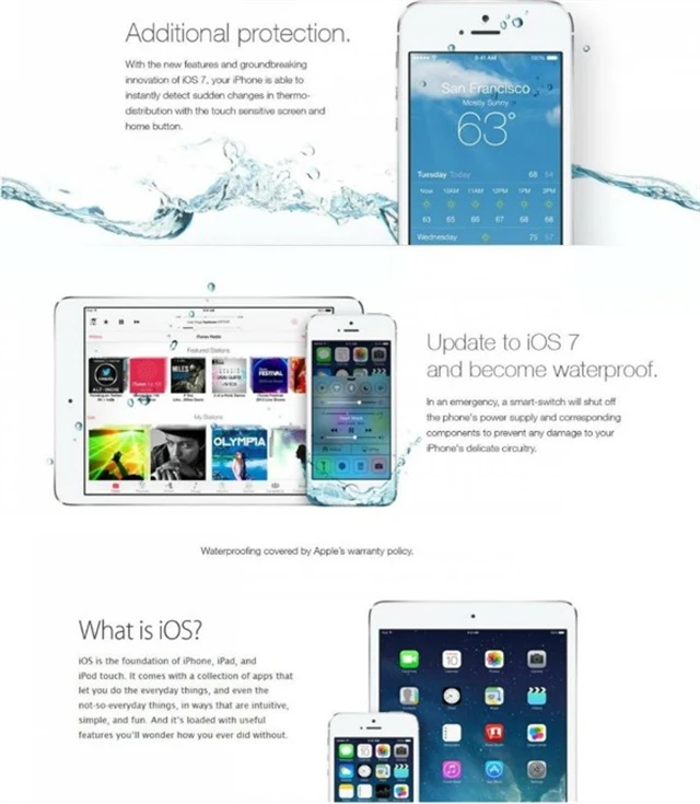 Sociálními sítěmi se rozletěla falešná reklama na voděodolné účinky aktualizace softwaru iPhonů na iOS 7. Reklama používající font i čistou grafiku typických reklam společnosti Apple, uživatelům radí: "Aktualizujte na iOS 7 a budete voděodolní." Tím však nekončí a teorii rozvíjí slovy: "V případě nouze chytrý spínač odpojí zdroj energie zařízení a související součástky, aby zabránil poškození obvodů." Lidé, kteří na to vtipálkům skočili, se nejen přiznali, ale ještě vyjádřili svůj vztek na Twitteru: "OK, kdokoli řekl, že iOS je voděodolný, ať jde do p*dele." Nebo: "WTF, iOS7 není voděodolný! Teď je můj telefon na dně řeky."