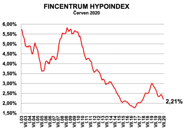 Průměrná úroková sazba hypoték v ČR klesla v červnu na 2,21 % z 2,3 % v květnu. Vyplývá to z Fincentrum Hypoindexu. Objem poskytnutých hypotečních úvěrů vzrostl meziměsíčně o 27 % na téměř 21 miliard Kč, a zájem o úvěry na bydlení tak byl nejvyšší od listopadu 2018.