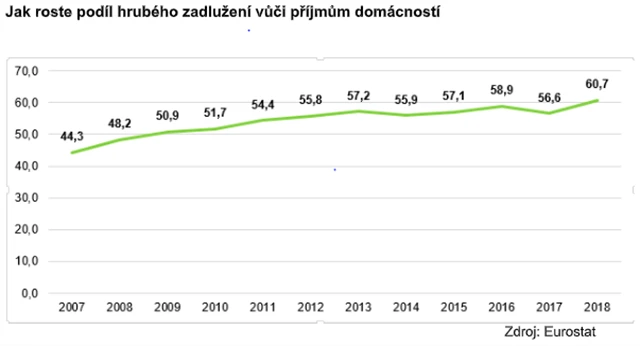 Stále více Čechů ale k financování svých potřeb využívá i půjčené peníze. Jen za poslední desetiletí vzrostl podíl dluhů domácností vůči jejich příjmům o deset procentních bodů na 60,7 %. Velkou měrou se na tom podílí výdaje na pořízení bydlení. Ze statistik České spořitelny vyplývá, že zatímco v roce 2009 činil podíl hypoték na veškerých úvěrech domácnostem 57 %, v současnosti již tento poměr dosahuje 71 %. Poměr dluhů vůči příjmům domácností v postkomunistických zemích v poslední dekádě narostl kromě Česka také na Slovensku, ve Slovinsku a v Polsku.