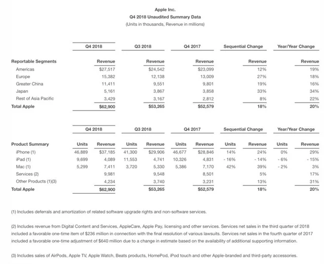 Firma ve čtvrtém finančním čtvrtletí, které skončilo 30. září, prodala zhruba 46,9 milionu telefonů iPhone ve srovnání s 46,7 milionu před rokem. Analytici čtvrtletní prodej iPhonů odhadovali na 47,5 milionu. Průměrná prodejní cena přístrojů ovšem stoupla na 793 dolarů, takže výrazně překonala očekávání. Zisk na akcii dosáhl 2,91 USD, analytici čekali 2,78 USD.
