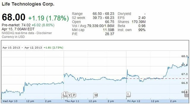 Společnost Thermo Fisher kupuje Life Technologies za 11,4 miliardy dolarů, tedy za 76 dolarů za akcii.