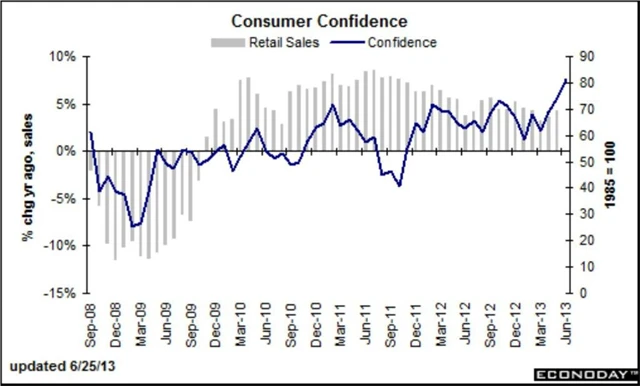 Důvěra spotřebitelů v červnu dopadla nečekaně lépe než v květnu. Index dosáhl 81,4 bodu, čekalo se 75,4 bodů (květen revidován na 74,3 z 76,2 bodu). Conference Board, která do této chvíle předávala médiím data s předstihem, se rozhodla tento postup ukončit kvůli úniku informací, na němž profitovali HFT tradeři.