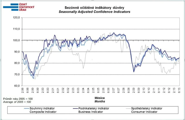 Celková důvěra v domácí ekonomiku v srpnu stoupla. Souhrnný indikátor důvěry (indikátor ekonomického sentimentu) se ve srovnání s červencem zvýšil o 1,4 bodu. Indikátor důvěry podnikatelů se meziměsíčně zvýšil a to: ve vybraných odvětvích služeb se důvěra zvýšila, v obchodě se zvýšila mírně, v průmyslu se nezměnila a ve stavebnictví se snížila. Důvěra spotřebitelů meziměsíčně vzrostla. Ve srovnání s hodnotami v srpnu 2012 jsou souhrnný indikátor důvěry a indikátor důvěry spotřebitelů vyšší, indikátor důvěry podnikatelů je nižší.