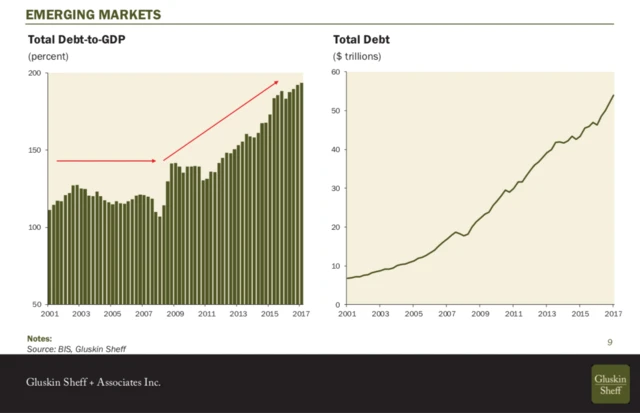 Zadlužení na celém světě je alarmující. Kromě objemu vyvolává strach i rychlost, jakou dluhy rostou. Finanční krize neměla na růst dluhů prakticky žádný vliv (možná dokonce naopak). Celkový dluh rozvíjejících se zemí se blíží 60 bilionům dolarů a činí již téměř 200 % jejich HDP.