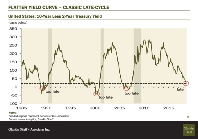 Podle analytiků z Gluskin Sheff bývá v době, kdy se výnosová křivka stává inverzní, příliš pozdě na nějaké investice, protože cyklus je u konce a přichází změna. Je načase se začít bát? Možná. A možná ne.