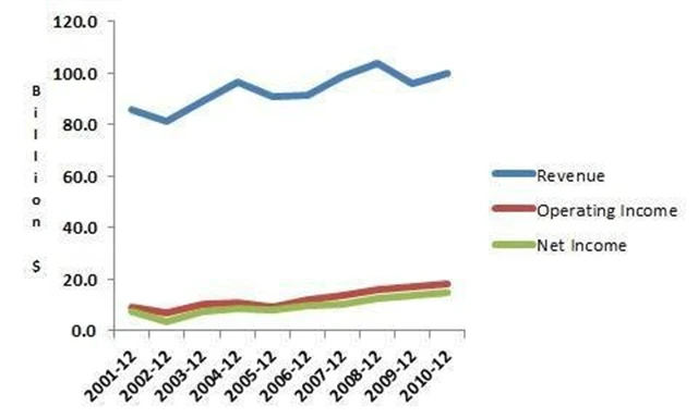 Ve stejném období (2001 až 2010) se proto čistý zisk téměř zdvojnásobil ze 7,7 na 14,8 miliardy USD.