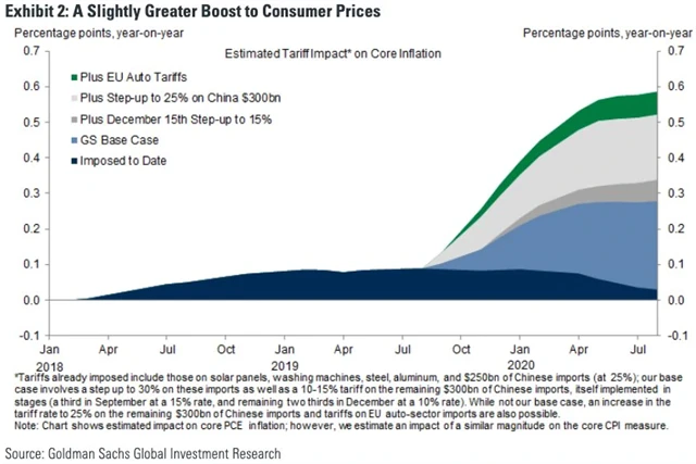 V případě uvedení cel v platnost banka očekává, že zvýšení tarifů o pět procentních bodů povede ke zvýšení tempa růstu jádrových spotřebitelských cen o dalších zhruba 0,05-0,10 procentního bodu do poloviny roku 2020.