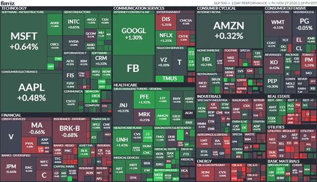 Akcie ve Spojených státech zakončily zkrácený týden růstem. Index technologického trhu Nasdaq se vyšplhal dokonce na nové rekordní maximum. Akciovému trhu pomáhala naděje na ekonomické oživení v příštím roce díky zprávám o vakcíně proti koronaviru, které převážily nad údaji o rostoucím počtu nakažených.