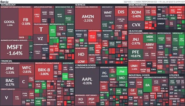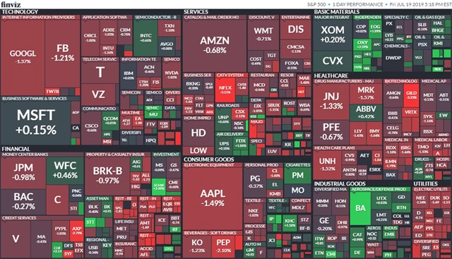 Trhy v pátek nejprve rostly díky výsledkům hospodaření Microsoftu (+0,15 %). Akcie společnosti během dne stouply až na rekordních více než 140 dolarů, nakonec však uzavřely pouze s mírným ziskem. Posílily také akcie výrobce letadel Boeing (+4,50 %). Firma oznámila, že kvůli problémům s letadly 737 MAX odepíše 4,9 miliardy USD, investoři však zřejmě čekali mnohem vyšší ztráty. Akcie American Express (-2,79 %) však kvůli varování před vyššími provozními náklady oslabily.