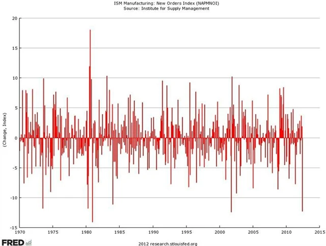 Vraťme se ještě indexu nákupních manažerů ISM ve Spojených státech, který byl zveřejněn v pondělí. Za jeho propad mohly především dvě položky - pokles očekávání ohledně nových objednávek a cen je velkým deflačním varováním. Jak ukazuje dlouhodobý graf, očekávání ohledně nových objednávek se nejníže od doby, kdy Usáma bin Ládin poslal sebevražedné útočníky zničit Světové obchodní centrum, Pentagon a Kapitol.