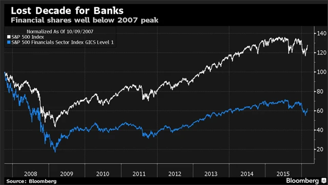 Podle Grosse je podobná situace dlouhodobě neudržitelná a vytváří na trzích problémy. Nejvíce se to samozřejmě projevuje u bank a v cenách jejich akcií. Podle Grosse nebyl nedávný pokles cen v bankovním sektoru způsoben ani tak strachem z bankrotů zadlužených těžařů ropy, ale právě nízkými sazbami (a tím pádem klesajícími úrokovými maržemi). Ceny akcií velkých bank, jež jsou v porovnání s předkrizovými úrovněmi stále nízké, jsou toho důkazem.