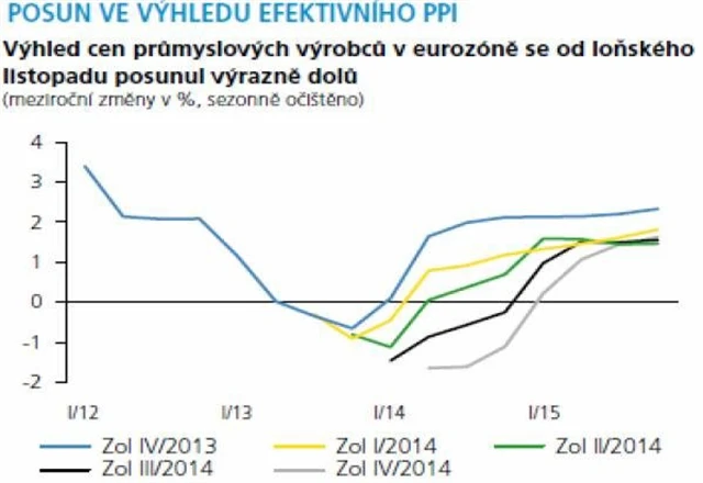 Scénář nízké ekonomické výkonnosti a inflace (či deflace) v eurozóně je z našeho pohledu velmi reálný a může trvat delší dobu. Tedy pokud se ECB nepodaří rychle rozhýbat ekonomiku eurozóny, v což ale příliš nevěříme, alespoň ne v krátkém horizontu. Finanční trh nám dává za pravdu, protože očekává v následujících pěti letech průměrnou inflaci v EMU mírně nad půl procentem. V takových podmínkách může česká inflace jen velmi těžko mířit k cíli bez dalšího zásahu ČNB.