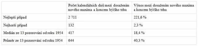 Z tabulky propočítané na základě 13 případů od zavedení S&P 500 v 50. letech je patrné, že po dosažení nového maxima pokračoval býčí trh v průměru dalších 644 dní (téměř dva roky) a nabídl investorům dodatečný zisk 40,3 %.