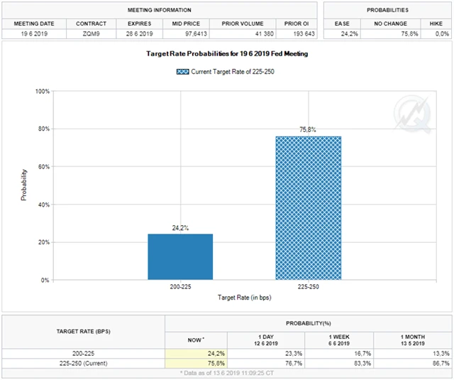 - V týdnu na sebe téměř veškerou pozornost strhne Fed. Trh počítá se snížením sazeb již v polovině prázdnin, ekonomové ze Société Générale ovšem připouštějí maximálně preventivní snížení sazeb ještě předtím, než americké ekonomice bude hrozit recese. K tomu ale ještě na červnovém zasedání nedojde. Záležet bude na vyznění celého prohlášení, představena bude také nová prognóza včetně mediánu výhledu úrokových sazeb.
