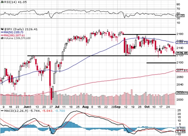 "Na denním grafu se formují nižší lokální dna (lower lows). Negativní pro další vývoj je také to, že se cena od poloviny října nevrátila nad 2 150 a nad 50denní klouzavý průměr. Index v pátek uzavřel lehce nad důležitou hladinou podpory 2 120, jejíž proražení by bylo signálem pro další pokles. Další support je o procento níže na 2 100, pak následuje 200denní klouzavý průměr okolo 2 080. Cenový odskok na 2 030 je od aktuální ceny 4,5 % a od rekordního maxima méně než 10 %, stále jsme tedy ve fázi běžné korekce," napsal v pravidelném technickém komentáři pro Investiční web opční obchodník Josef Košťál. "Výsledková sezóna zatím vyznívá pozitivně a také makroekonomické údaje jsou spíše příznivé, a to včetně prvního odhadu růstu americké ekonomiky ve třetím čtvrtletí. V pátek ovšem zamíchala kartami Hillary Clintonová, když kvůli dalšímu vyšetřování její elektronické komunikace trhy oslabily a ona sama ztratila část náskoku v předvolebních průzkumech. Prezidentské volby se konají 8. listopadu, a pokud se index S&P 500 udrží v současném rozpětí, mohl by 9. listopad být dnem, který na trhu zamíchá kartami."