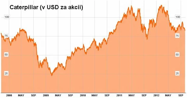 Akcie společnosti Caterpillar, největšího světového výrobce stavebních a těžebních strojů a zařízení, od svého únorového maxima oslabily o 30 %. Přestože indexy v USA nedávno překonaly několikaletá maxima, kurz akcií této společnosti se naopak pohybuje v blízkosti ročních minimálních hodnot.