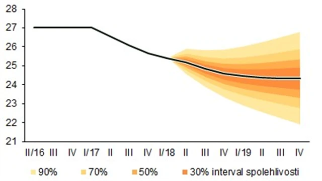 Hlavní ekonom Generali Investments CEE Radomír Jáč soudí, že s postupně rostoucí inflací v kombinaci s pomalejším posilováním koruny zvýší centrální banka úrokové sazby již na srpnovém zasedání. "Takové zvýšení úroků by zároveň pro korunu bylo novým impulzem k posílení, a česká měna by se tak v průběhu letošního třetího čtvrtletí nakonec měla dostat pod úroveň 25 korun za euro," míní. Poté by podle něj úroky ČNB měly po zbytek letošního roku zůstat stabilní. "Další pozvolné zvyšování sazeb ČNB bude podle mého názoru aktuální až v roce 2019," dodává Jáč.